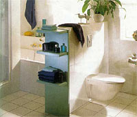 Разделителями пространства могут стать и более функциональные вещи, предметы мебели, например, в маленьком санузле зоны туалета и умывальника можно отделить друг от друга узким шкафом с выдвижной секцией, а сам шкаф расположить на электронагревателе, дополняющем систему электрообогрева пола или другом используемом в ванной предмете. Для полного комфорта расстояние от перегородки или стенки шкафа до унитаза должно составлять не менее 25 см. Монтажный узел сантехнического оборудования с облицовочной панелью, встроенный в угол, отнимает минимум полезного пространства.