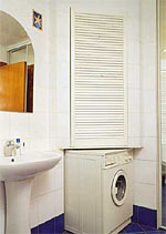 Большие перспективы открывают угловые решения. В углу может отлично разместиться стиральная машина и небольшая угловая кладовка над ней, иногда отлично вписывается ванна, раковина, унитаз, освобождая "традиционные" свои места.