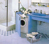 Мебель и оборудование. В ванной комнате важно оптимально использовать возможности для хранения вещей, не жертвуя при этом свободным пространством. Специально для небольших ванных комнат разрабатываются компактные ванны, душевые установки, зеркала, шкафы, малогабаритная мебель. Компактная светлая мебель из одной и той же коллекции придает помещению легкость. Практичной и удобным может оказаться стеллаж на роликовых опорах из хромированного металла с выдвижными контейнерами из проволочной сетки. Пространство под столешницей умывальника и над ним максимально используем для размещения полок и шкафов.