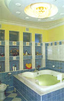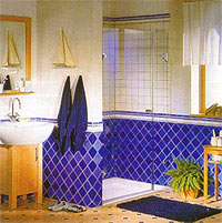 Цвет в ванной задают в основном настенная и напольная плитка. Здесь действует общее для всех типов помещений правило: светлые тона и прозрачные материалы зрительно расширяют пространство, темные уменьшают. Откажитесь от темных или слишком ярких тонов плитки, от плитки с крупным рисунком. Сверкающие поверхности тоже не подойдут - они утяжеляют впечатление. Поверхности и плитки и мебели лучше выбирать матовые. Уложенная по диагонали напольная плитка зрительно увеличивает помещение.