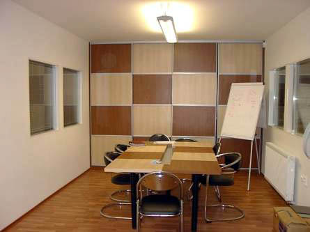 Менее дорогой вариант — шкаф-купе с дверками из цветного матового стекла. Стеклянные двери несколько дороже зеркальных, но гораздо дешевле шпонированных. Фирмы, производящие подобные шкафы, могут предложить вам бесчисленное количество вариантов вставок и декоров. Богата и цветовая гамма. Поэтому шкафы-купе со стеклянными вставками вписываются в любой интерьер. Стекло может разбиться? Современные технологии на 95% исключают эту возможность. В любой уважающей себя фирме, чтобы доказать это, вам должны продемонстрировать прочность стекла, стукнув по нему чем-нибудь не очень тяжелым.