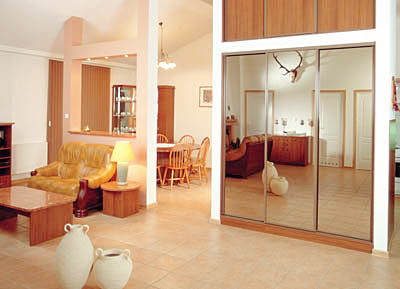 Честно говоря, удручает то, что большинство ламинированных шкафов-купе похожи друг на друга как близнецы. Впрочем, этот недостаток легко исправить. В настоящее время многие фирмы работают с так называемыми элитными моделями, призванными услаждать глаз заказчика. Если вы на дух не переносите ламинат под дерево, а признаете только деревянную мебель, можете заказать филенчатые двери, отделанные натуральным шпоном дуба, вишни, ореха, бука и т. д. Правда, за это придется выложить кругленькую сумму: шпонированные двери могут увеличить стоимость всего шкафа в два или даже три раза. Но красота требует жертв. Незамысловатый ламинированный шкаф вряд ли будет подходящим соседом дорогим филенчатым дверям и хорошей деревянной мебели из дуба или из ореха.