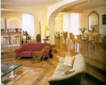 Подвесные потолки, арочные проемы, выступающие конструкции, колонны - все можно применить для зонирования. Хорошо использовать в двух разных зонах различные напольные покрытия. Сочетания кафеля на кухне и паркета или линолеума в столовой. Выбирайте индивидуальные цветовые композиции для каждой из зон. Интересно подчеркивает различие пространств и световое решение интерьера, на кухне можно использовать галогенные лампы и точечные светильники, столовую же отдайте дневному свету и общему освещению в вечерние часы. Индивидуально для каждого функционального пространства оформите окна.