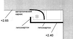 Но, наверное, для гостиной такой прием в варианте один к одному не очень подойдет. В гостиной тоже можно устроить потолок с перепадом высоты, но наиболее высокая зона должна приходиться на середину комнаты. Вырез высокой зоны может иметь форму овала (если комната прямоугольная) или круга (если квадратная). Можно вырезу придать форму подковы, открытой в сторону окна. (см. рисунок). Высота по периметру комнаты уменьшена до 2,25-2,3 м.